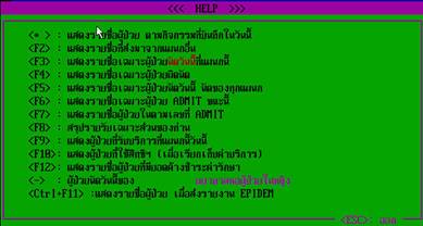 | จะเห็นว่าระบบงานผู้ป่วยใน สามารถดูรายชื่อผู้ป่วย ได้ด้วยการกดปุ่ม F6 , F7 ต่อไป จะเรียกสั้นๆนะครับ เช่น F6 หมายถึงการกดปุ่ม F6 ที่แป้นพิมพ์ |