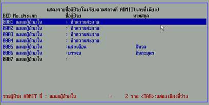 | เลือก ENTER เพื่อดูประวัติ ในคนไข้ที่เราต้องการ ลูกศร เลือกคนไข้ หรือจะดูเฉพาะเตียงว่าง กด TAB |